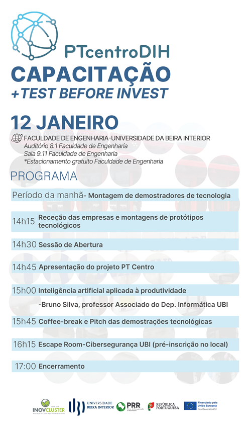 Os roadshows integram um dos serviços-chave do PTCentroDIH — o Test Before Invest — que permite às entidades experimentar tecnologias digitais inovadoras antes de avançarem para investimentos significativos, reduzindo riscos e aumentando a confiança na tomada de decisão.