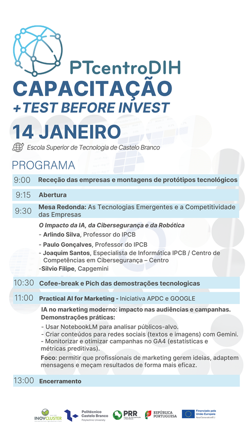 Com o título “Capacitação + Test Before Invest”, estes eventos destinam-se a empresas, PME, organizações públicas e privadas que pretendam acelerar o seu processo de transformação digital de forma informada e segura.
