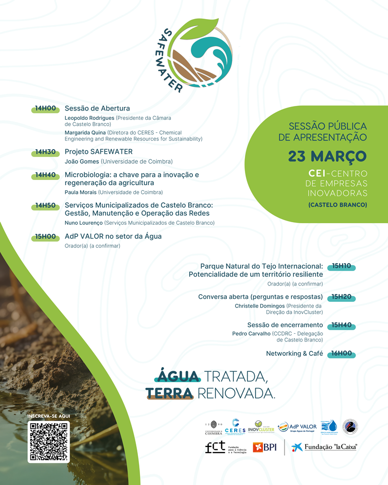 No próximo dia 23 de março, às 14H00, terá lugar no CEI – Centro de Empresas Inovadoras de Castelo Branco o evento de apresentação do novo projeto SAFEWATER.